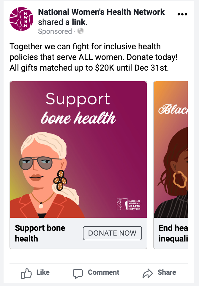 The National Women’s Health Network (NWHN) is a women’s health nonprofit organization that aims to give women a voice in health care by providing accurate, science-based consumer health education, being an FDA watchdog, and advocating for equitable women’s health policies at the federal level. This carousel ad was for their End of Year Campaign calling for donations to help continue on their work of protecting women’s health, supporting aging women’s health (bone health), Black women’s health, and holding the FDA accountable for drug safety.