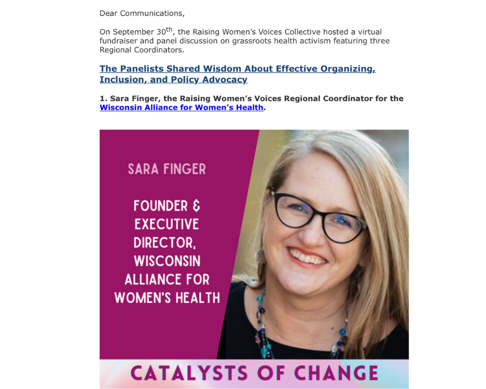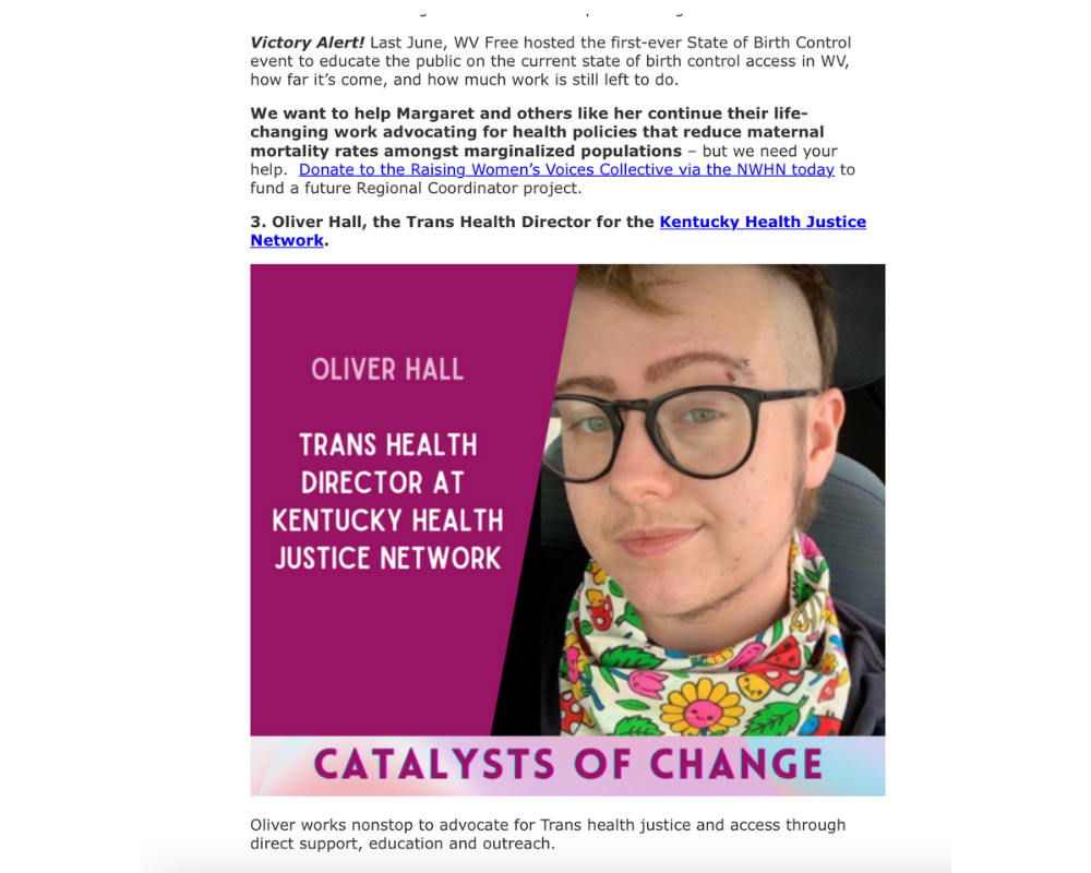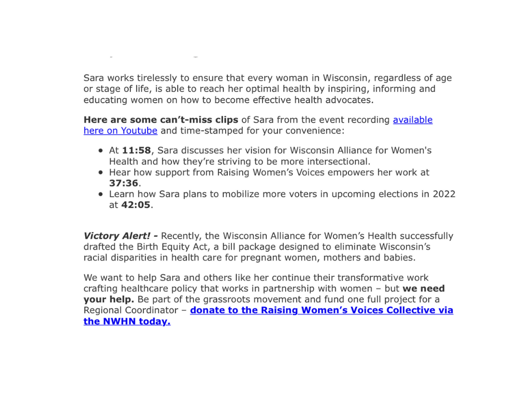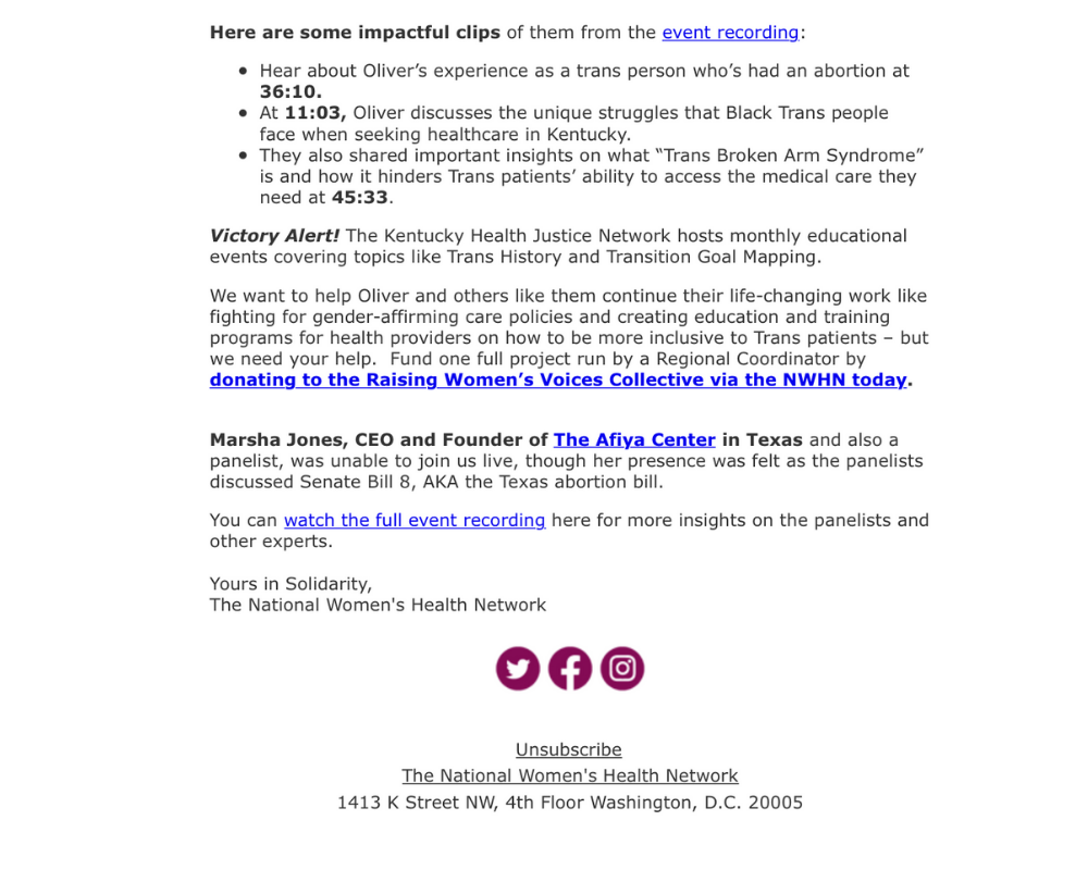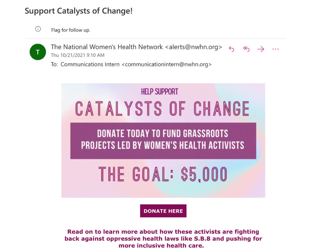 The National Women's Health Network (NWHN) is a women’s health nonprofit organization that aims to give women a voice in health care by providing accurate, science-based consumer health education, being an FDA watchdog, and advocating for equitable women’s health policies at the federal level. This member email is calling for donations to the NWHN to support grassroots health organizations that the NWHN provides training and technical assistance to (they were part of an event held by the NWHN - Catalysts of Change). For further email samples that I’ve written, please visit my Copywriting service page which can be found on my Portfolio tab.