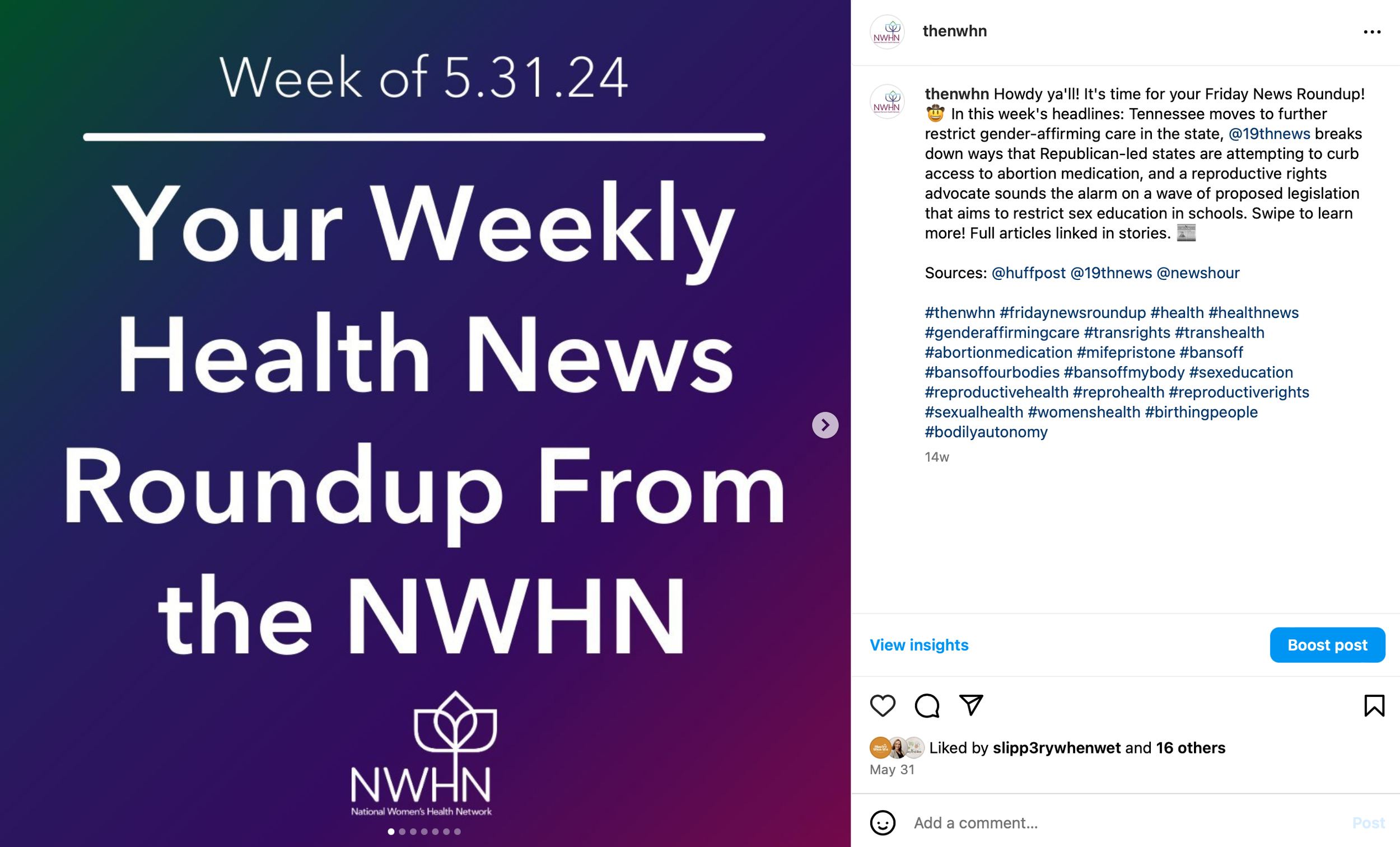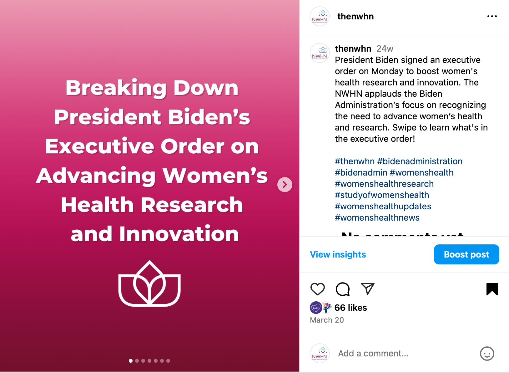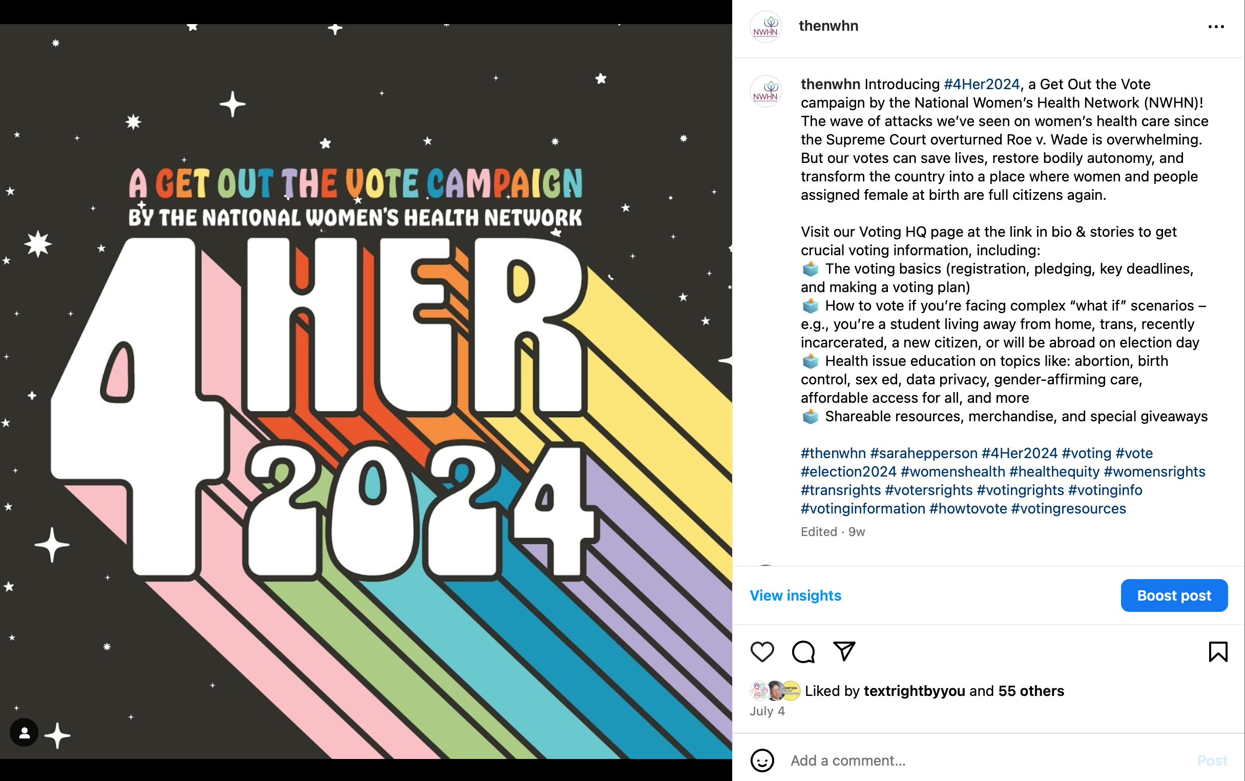 These organic social media posts are for the National Women’s Health Network (NWHN), the NWHN is a national women’s health nonprofit organization that is dedicated to ensuring that women have a voice in health care by providing accurate, science-based consumer health education, being an FDA watchdog, and advocating for equitable women’s health policies at the federal level. The NWHN wanted to attract a younger audience so these posts are visually-appealing and full of valuable information targeted at young folks. With the exception of the #4Her2024 Get Out the Vote post, all graphics seen here are designed by me via Canva.