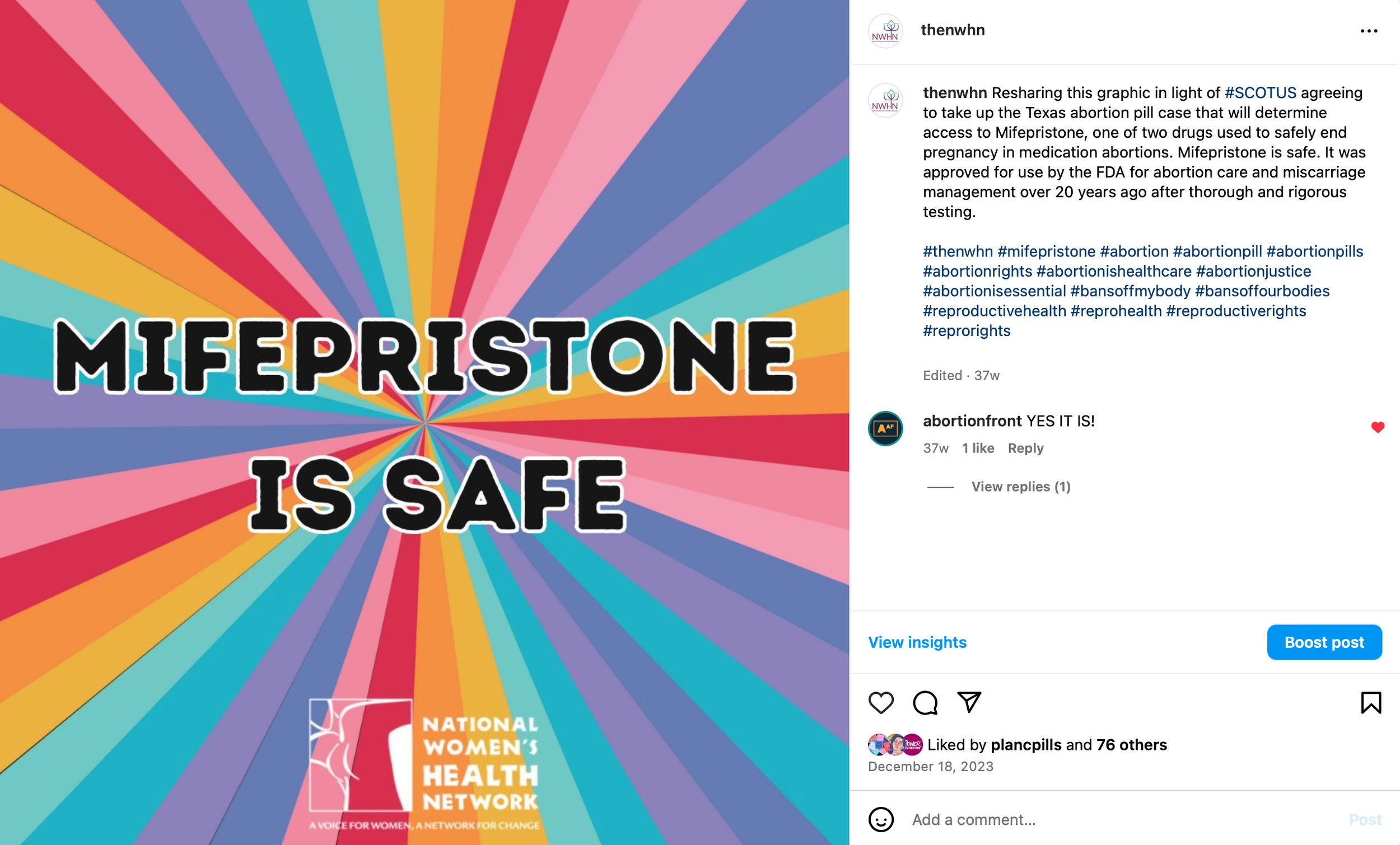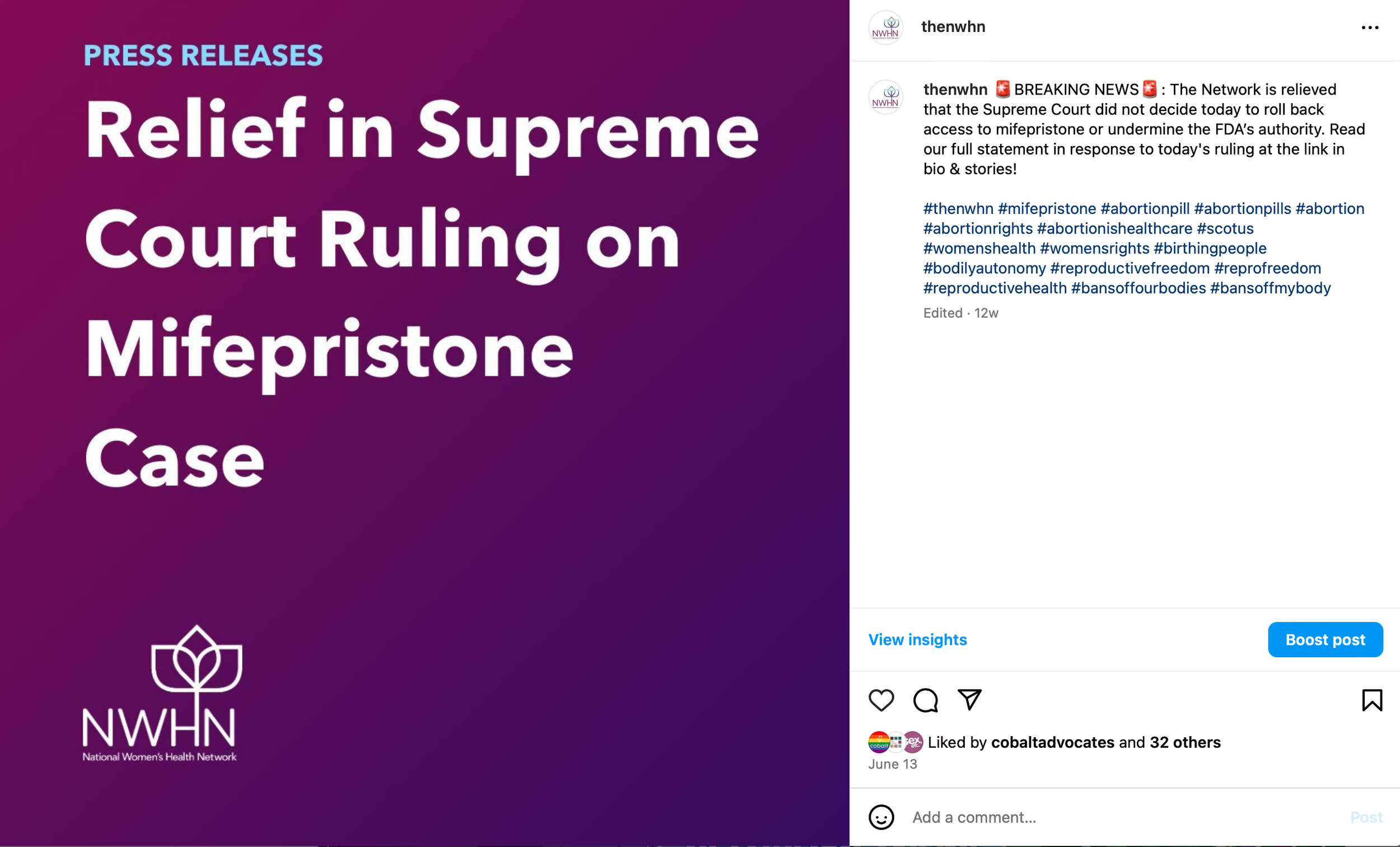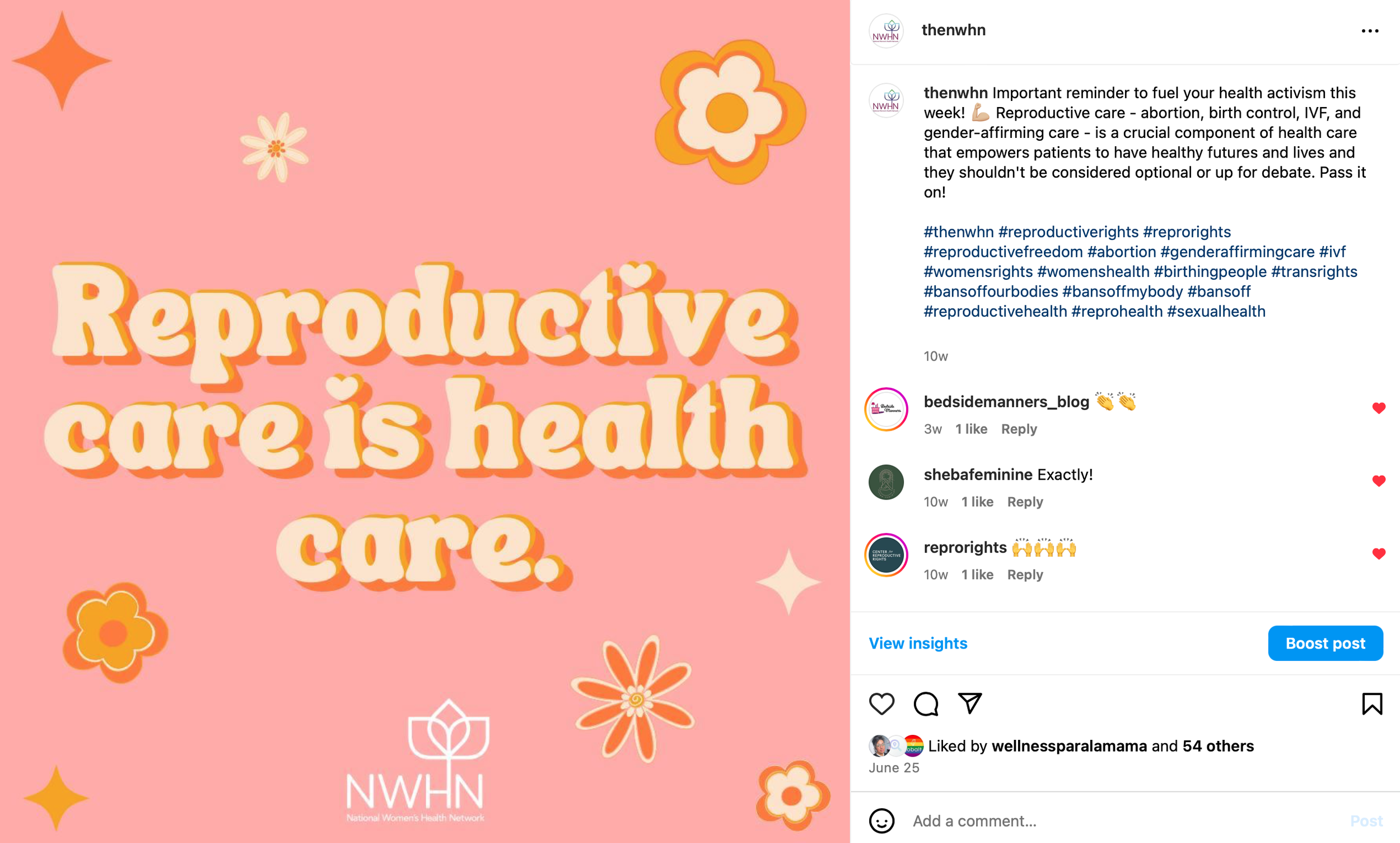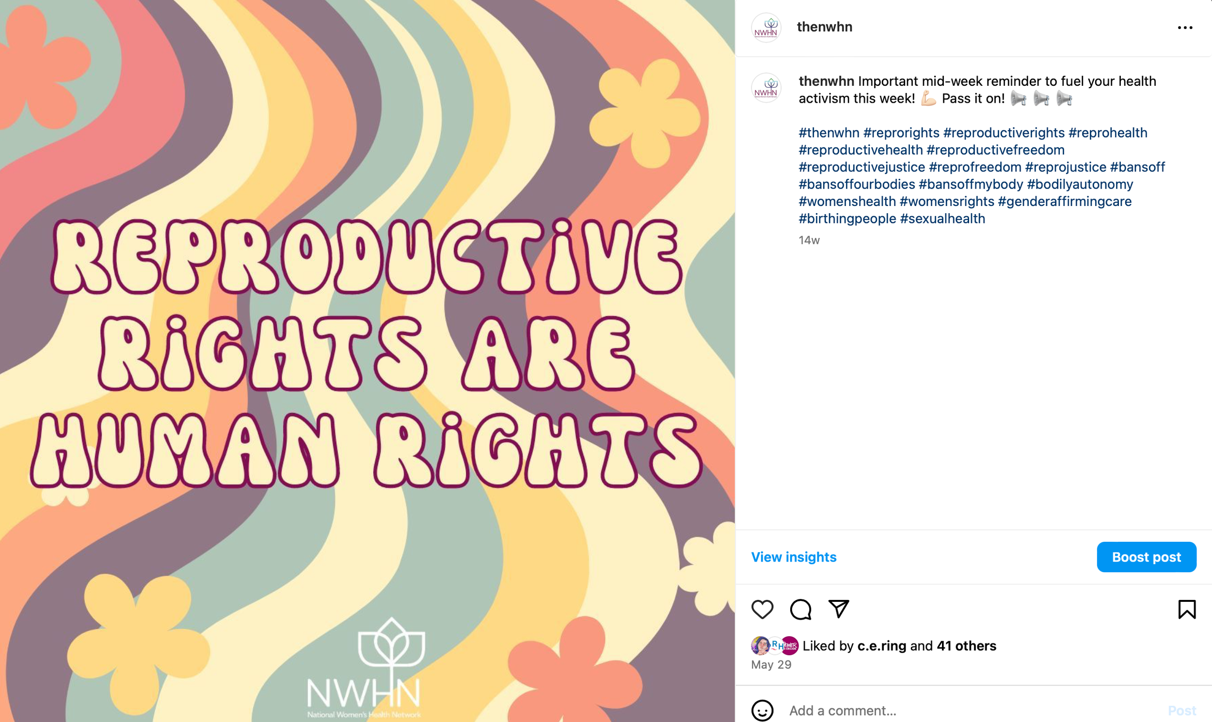 These organic social media posts are for the National Women’s Health Network (NWHN), the NWHN is a national women’s health nonprofit organization that is dedicated to ensuring that women have a voice in health care by providing accurate, science-based consumer health education, being an FDA watchdog, and advocating for equitable women’s health policies at the federal level. The NWHN wanted to attract a younger audience so these posts are visually-appealing and full of valuable information targeted at young folks. With the exception of the #4Her2024 Get Out the Vote post, all graphics seen here are designed by me via Canva.